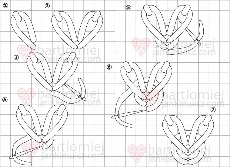 Z jednego punktu pod różnymi kątami (najlepiej 30 stopni od osi symetrii) wykonujemy dwie margerytki, a następnie z punktu poniżej punktu początkowego przeciągamy nitkę pod oboma margerytkami i wbijamy w ten sam punkt uzyskujemy w tedy okrągłą przeplatankę. Następnie wybijamy się w punkcie poniżej i powtarzamy procedurę.