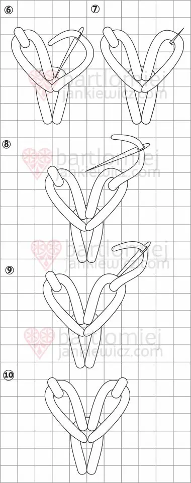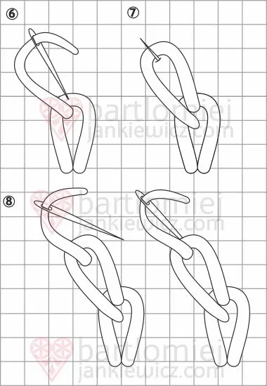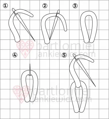Pętelka jest teraz zahaczona o nitkę. Następnie wbijamy igłę w punkt wyjścia, tak aby utworzyła się z nitki kolejna pętelka. Igłę ustawiamy pod skosem w stosunku do osi symetrii po lewej stronie i wybijamy ja na prawą stronę o podobną długość jak za pierwszym razem. Pętelkę ustawiamy pod igłą. Zaciągamy nitkę i wbijamy igłę w materiał w punkcie po drugiej stronie pętelki do punktu z którego wychodzi nitka. Nitka pomiędzy punktami, a nad pętelką, to nitka trzymająca.