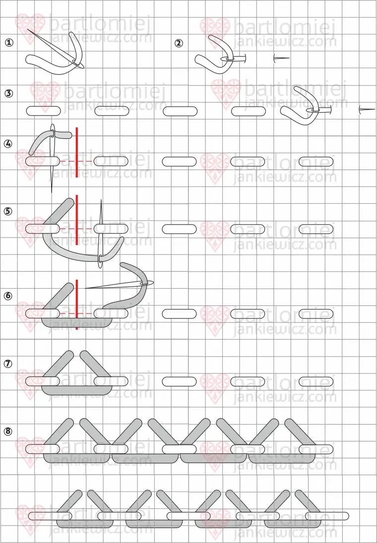 Następnie nawlekamy drugą nitkę (może być w innym kolorze i/lub innego typu), aby wybić się na prawą stronę, ustalamy sobie linię prostopadłą do linii fastrygi pomiędzy nitkami i wybijamy się niżej od fastrygi, nieco na lewo od wyznaczonej linii. Po wybiciu się na prawą stronę tkaniny, przeciągamy igłę z nitką pod odcinkiem fastrygi po lewej stronie, następnie pod odcinkiem po lewej stronie i wbijamy się w punkt po prawej stronie osi symetrycznie do lewego. Procedurę ta powtarzamy na całej długości ściegu.